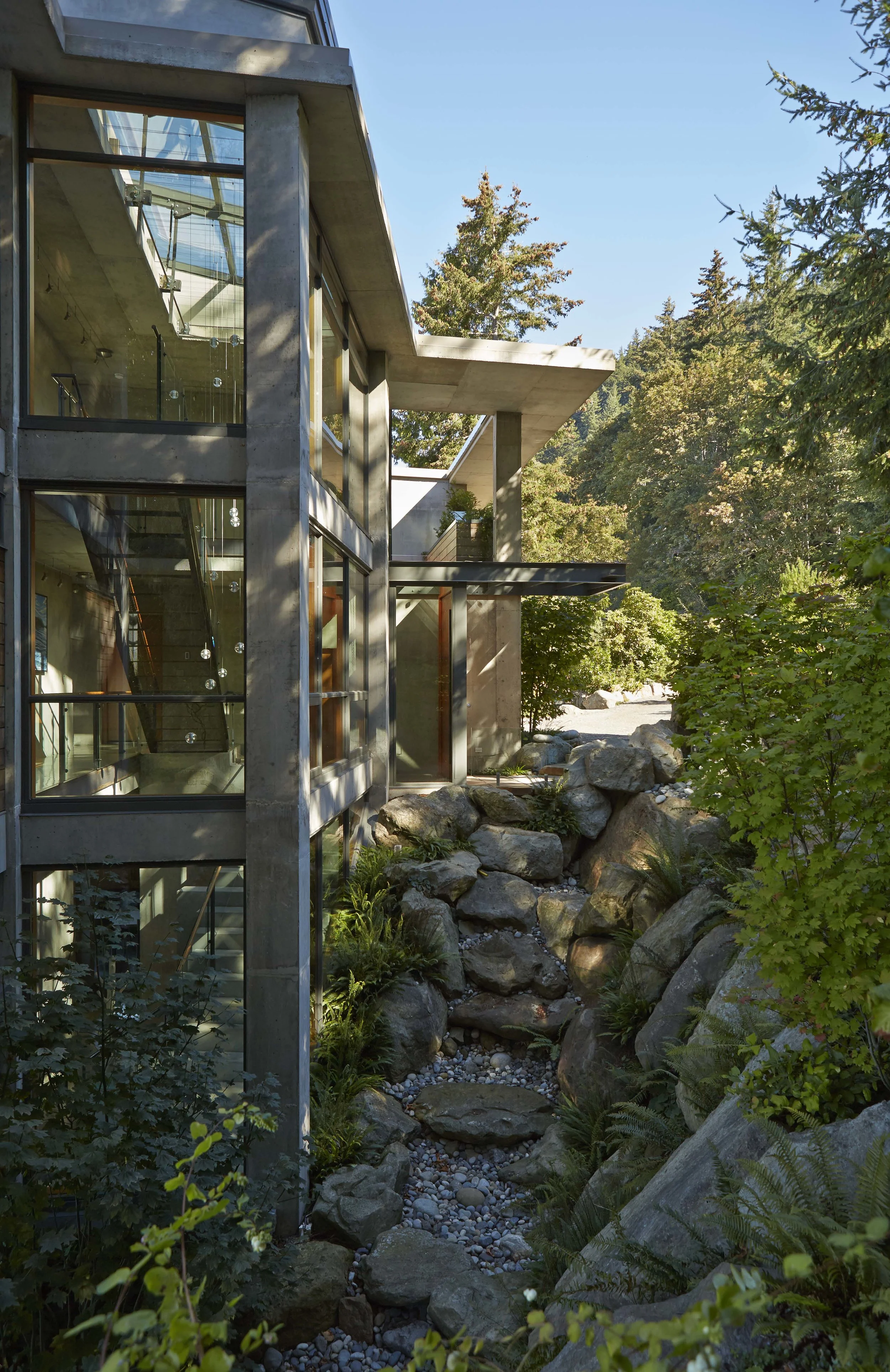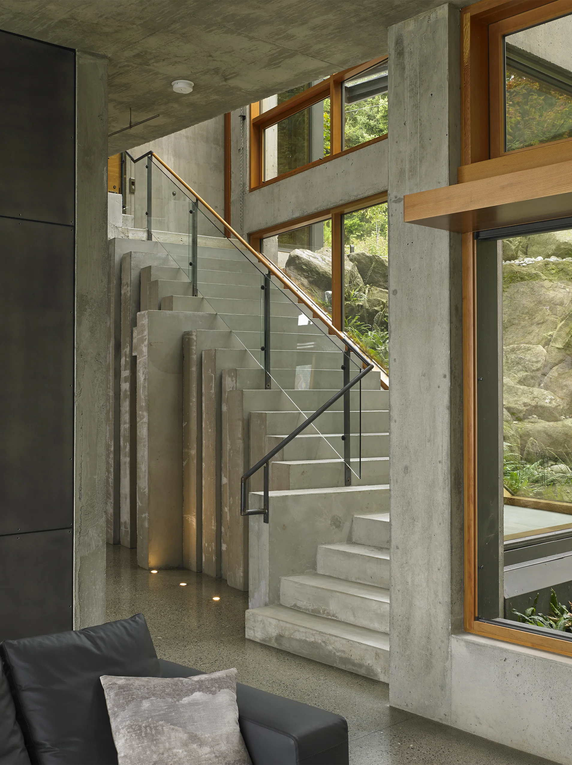 Located on the Pacific Northwest waterfront along Bellingham Bay, 'Bay House' reflects the region's palette. Crafted from architectural concrete with warm wood accents, it seamlessly integrates into the rocky hillside. A massive custom pivot door leads to an entry flooded with warming natural light that bathes the space through a sizable operable skylight, illuminating the steel stair and sculptural concrete below. The living space includes a sizable lift and slide door and a custom wood-burning fireplace. Surrounded by Pacific Northwest lushness, the house harmonizes modern architecture with nature, and captures the perks of a waterfront lifestyle. On the third story, the primary bedroom features a unique cantilevered bed and offers panoramic waterfront views from a private deck with a minimal glass railing.