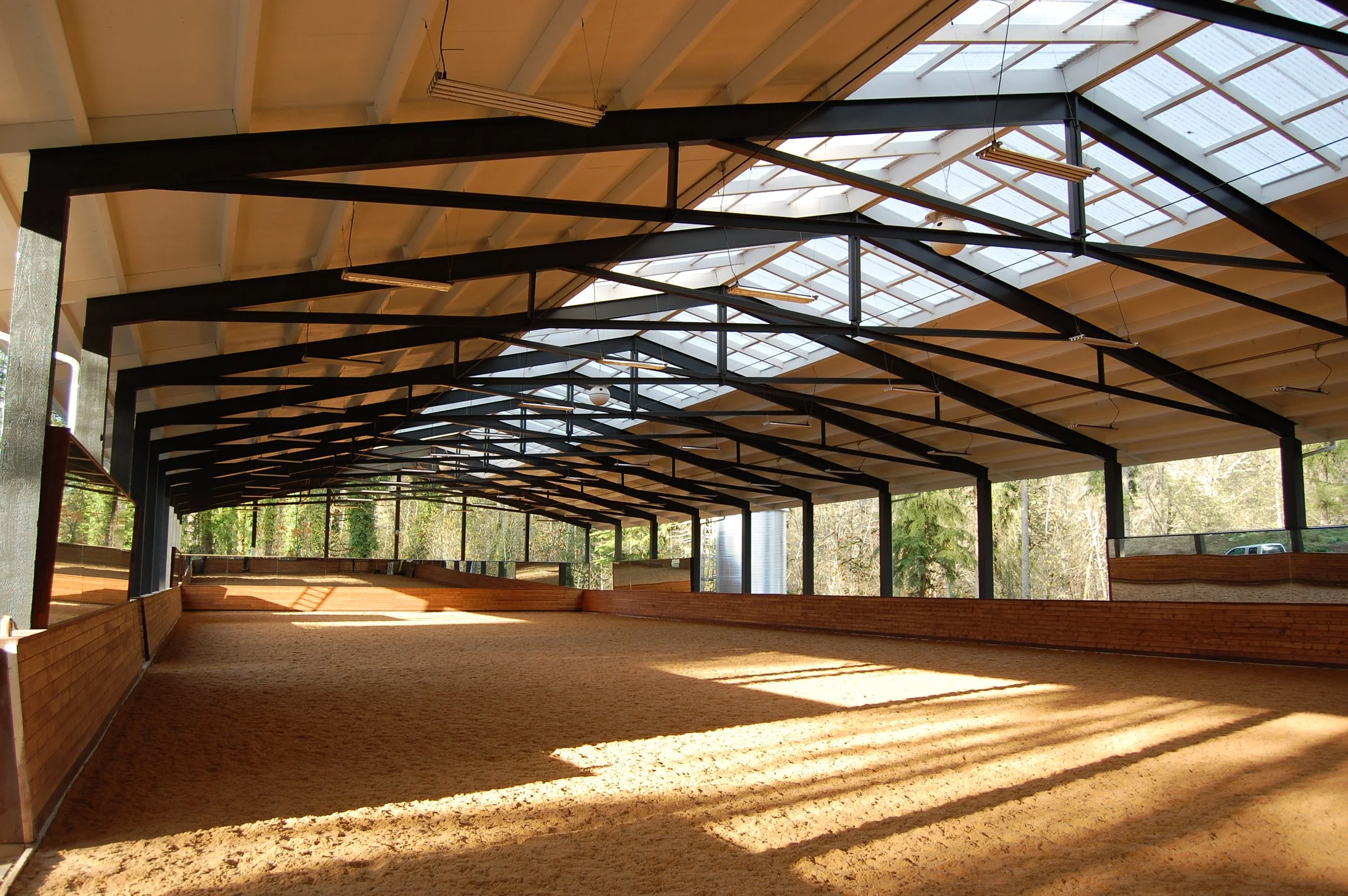 This 20 acre equestrian estate is located along the Snoqualmie River near the foothills of the Cascade Mountains, east of Seattle. The covered riding arena is constructed from heavy timber wood columns, custom steel trusses, standing seam metal roofing, and a large central corrugated polycarbonate panel skylight to maximize natural lighting throughout. Due to the large footprint of the roof, extra steps were taken, working alongside a civil engineer, in order to properly manage the stormwater diverted from the arena on site. The property includes a riding arena with a viewing deck, a barn with a recent addition, a single family home, a round covered pen, and four separate pastures.