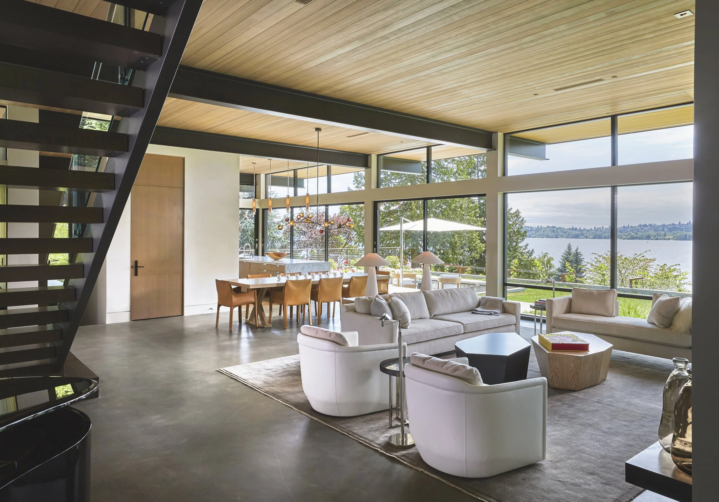 Atop Lake Washington, east of Seattle, the 'Perch House' seamlessly blends contemporary design with natural warmth. The primary suite offers stunning views over a green roof and a private deck raised among the treetops. Exposed steel frames connect seamlessly with panoramic vistas, merging indoor and outdoor spaces. A dramatic entryway welcomes guests with a concrete path, vibrant landscapes, and a grand steel door. Inside, a warm hemlock wood ceiling enhances the inviting ambiance, revealing bold details, including a pocket garden and a sculptural stairway. The 'Perch House' is a mix of modern luxury and natural serenity, inviting connection with its surroundings.