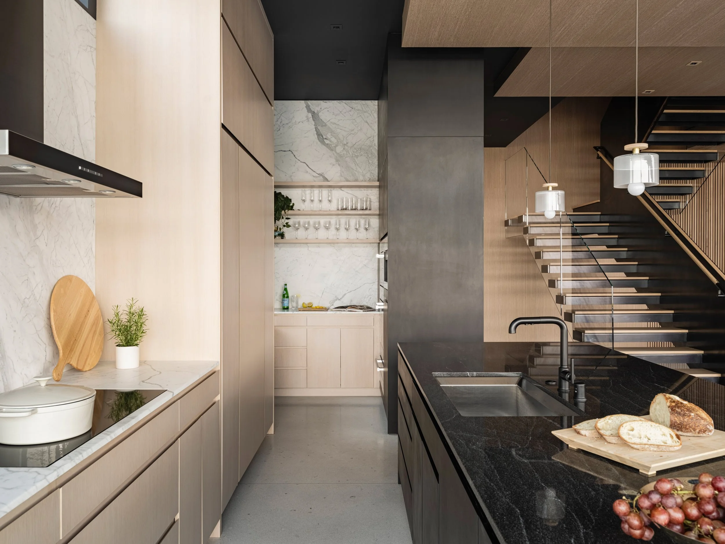 A custom, hot-rolled steel staircase dramatically anchors and intertwines the home's three levels as a sculptural centerpiece.
